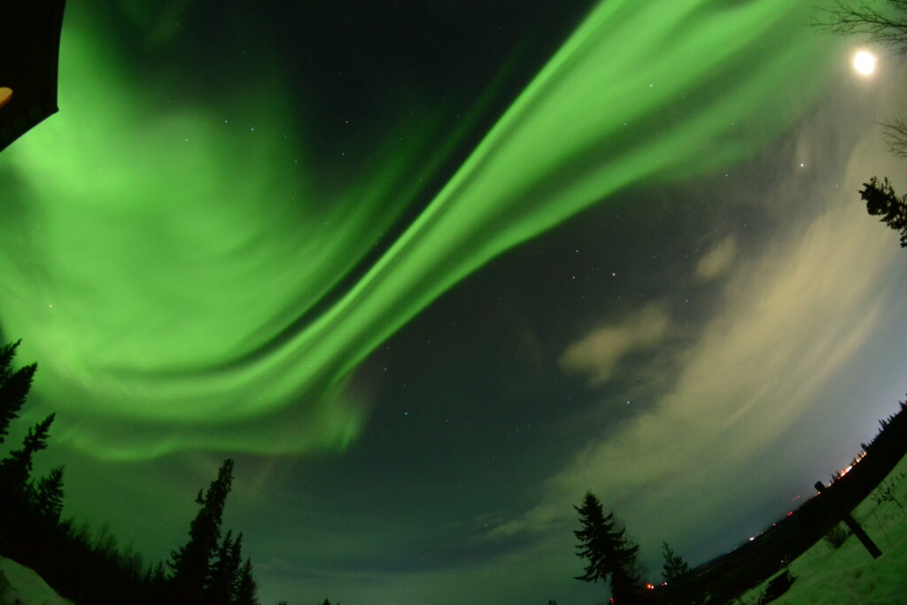 An example of aurora seen on our October 2017 Alaska land expedition. It is a huge Northern Lights band stretching 180 degrees across the sky from east to west. Constellations such as Orion, Gemini, Cassiopeia and Taurus are captured here. A brilliant Iridium satellite flare is also seen as the linear streak. Paul D. Maley photo.